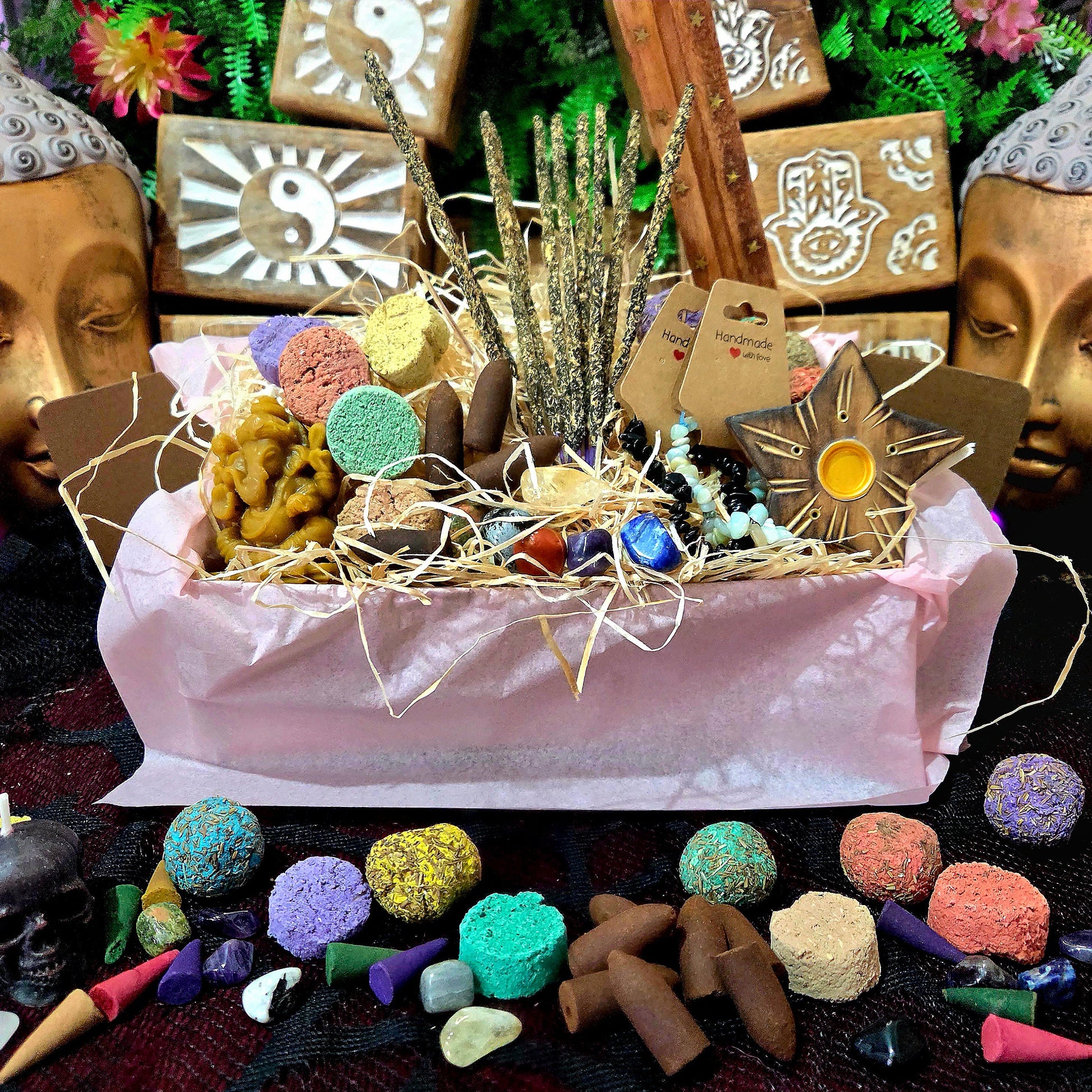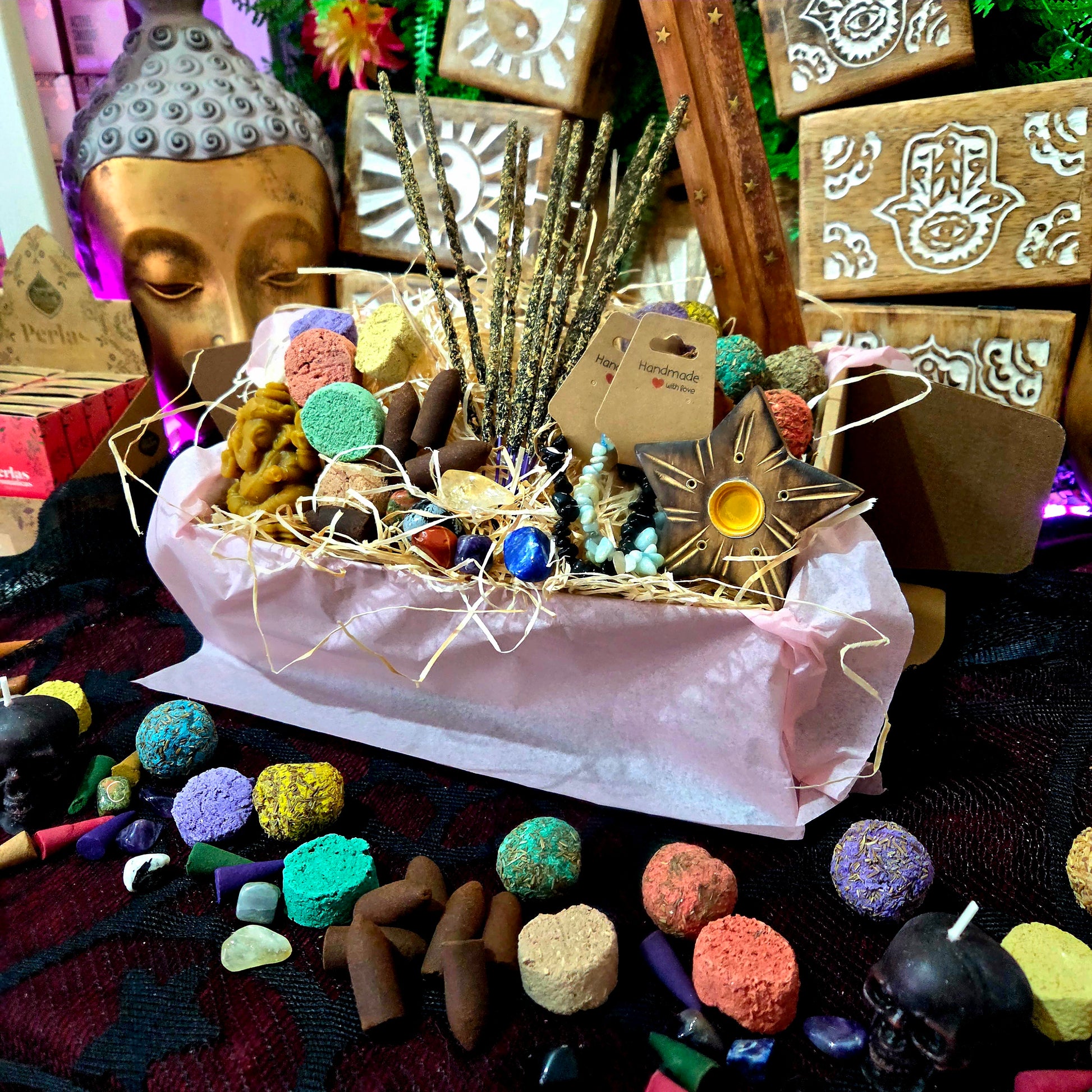 Cada caja está cuidadosamente preparada con una selección de artículos de nuestra tienda: inciensos, minerales, velas, cosmética artesanal, amuletos, decoración espiritual y mucho más.