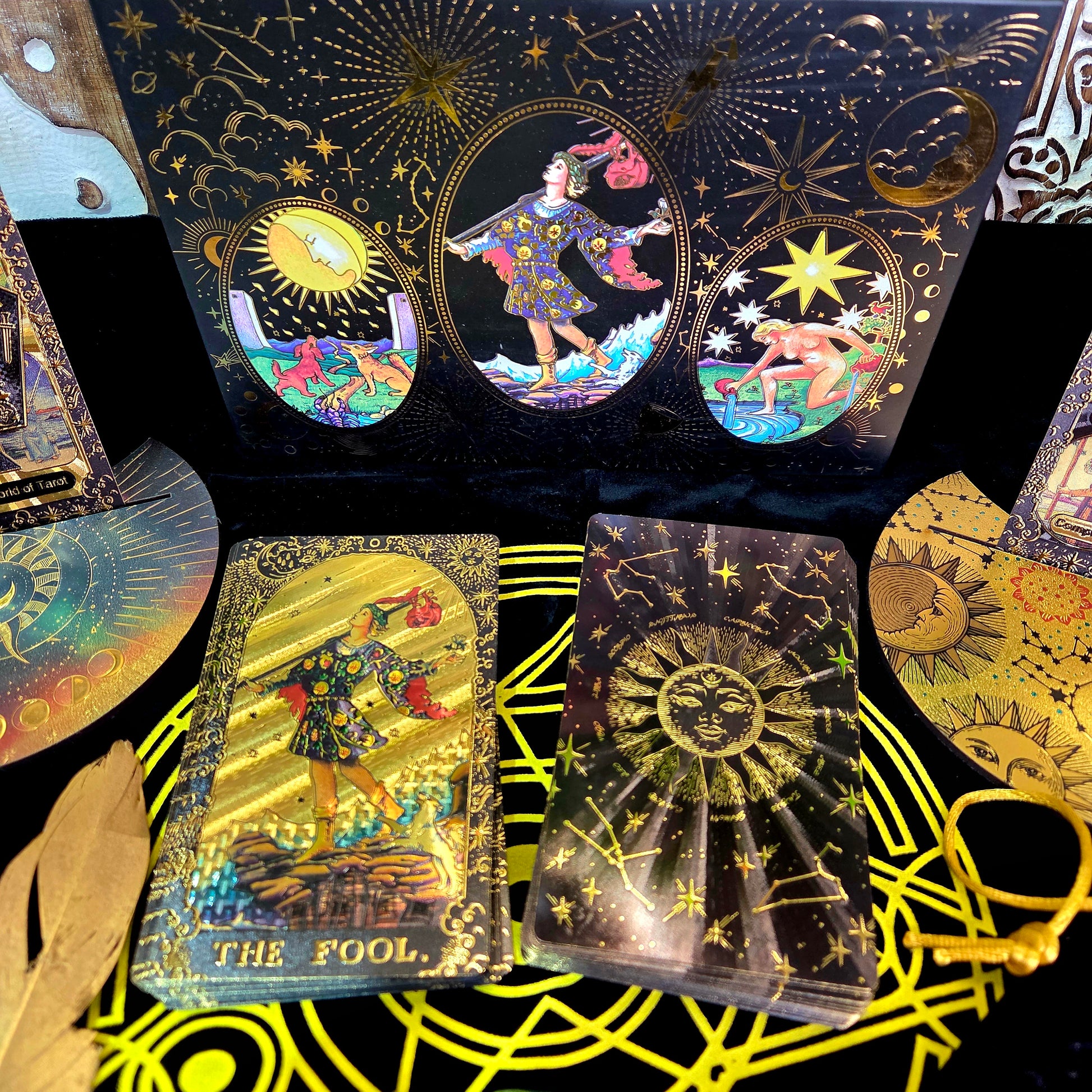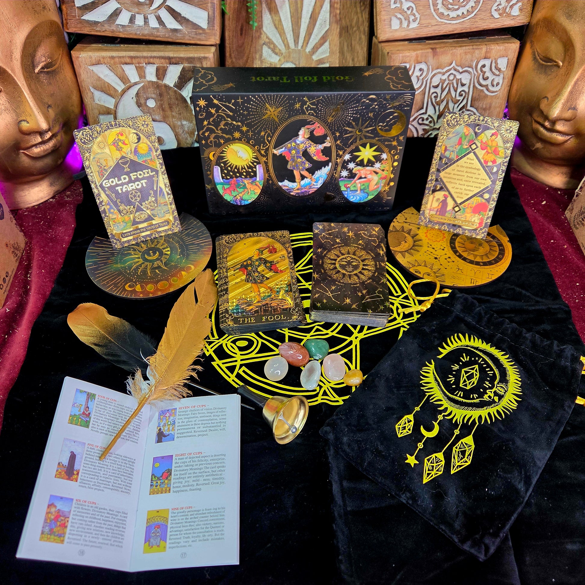 - Baraja de Tarot con lámina de oro : un juego de 78 cartas con detalles dorados brillantes que dan vida a las imágenes clásicas del tarot. divididas en: los Arcanos Mayores: 22 cartas que representan las lecciones más importantes de la vida, fuerzas cósmicas y energías arquetípicas. Y los Arcanos Menores: 56 cartas que representan experiencias, emociones y desafíos cotidianos, divididos en cuatro palos.