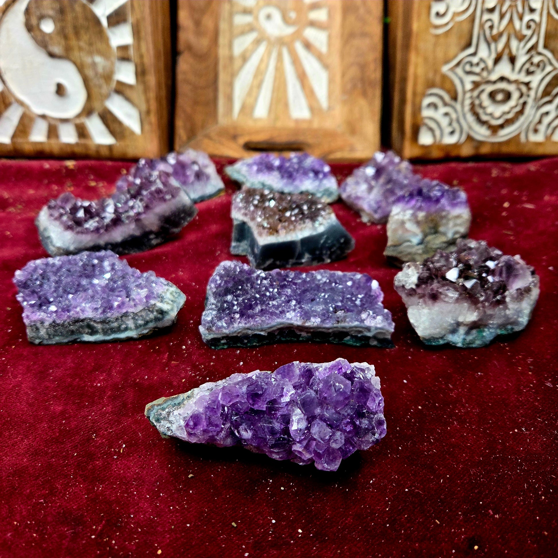 Las drusas de amatista son conocidas por sus propiedades calmantes y equilibrantes. Coloca estas maravillosas piezas en tu hogar, oficina o espacio sagrado para crear un ambiente de serenidad y armonía.