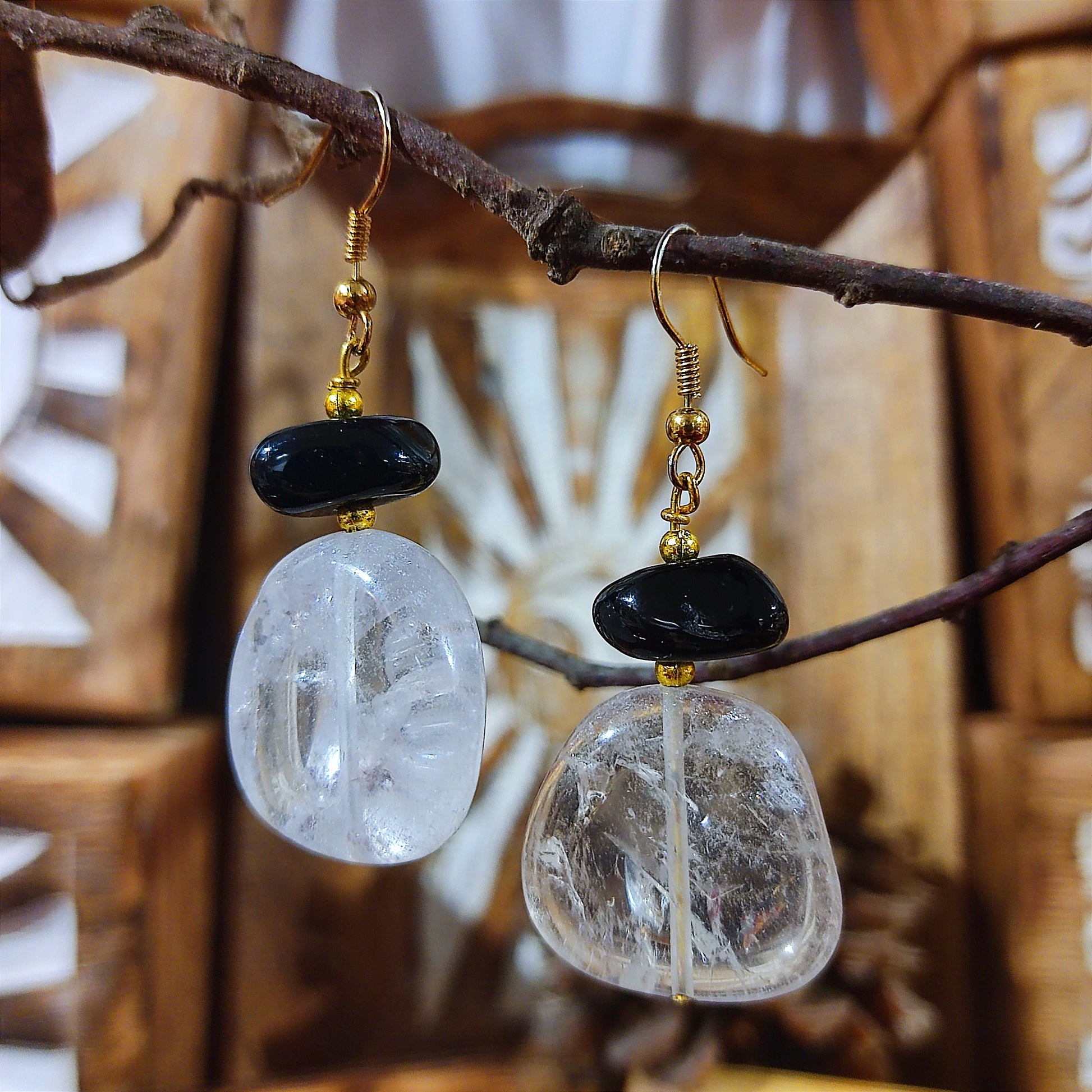 Pendientes Rodado Cuarzo Cristal y Ónix