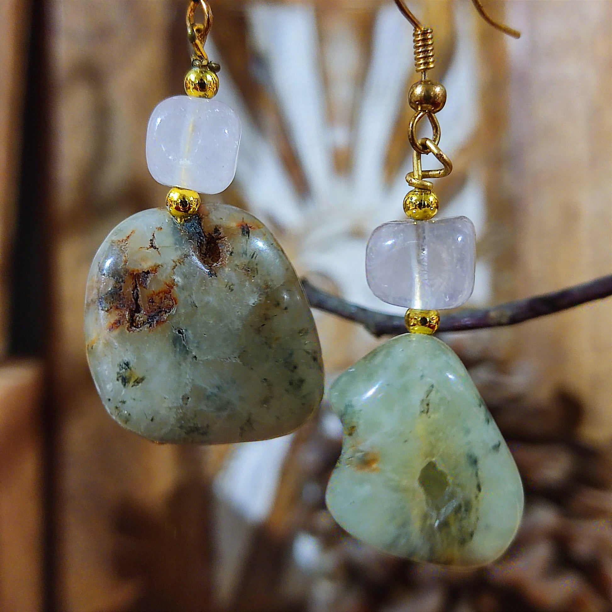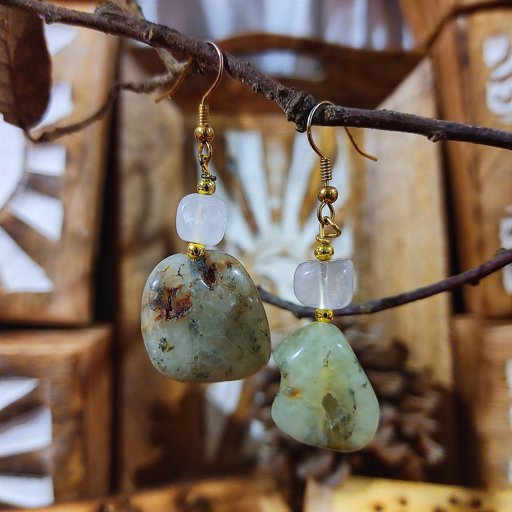 Pendientes Rodado Prehnita y Cuarzo Rosa