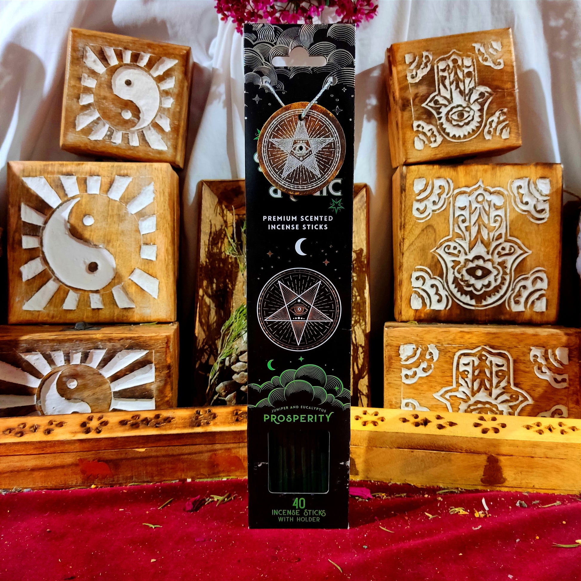 Cada caja contiene 40 varillas de incienso para disfrutar de una experiencia mágica y envolvente. La caja está bellamente decorada con pentagramas, lunas y estrellas, evocando un aura de misterio y magia.