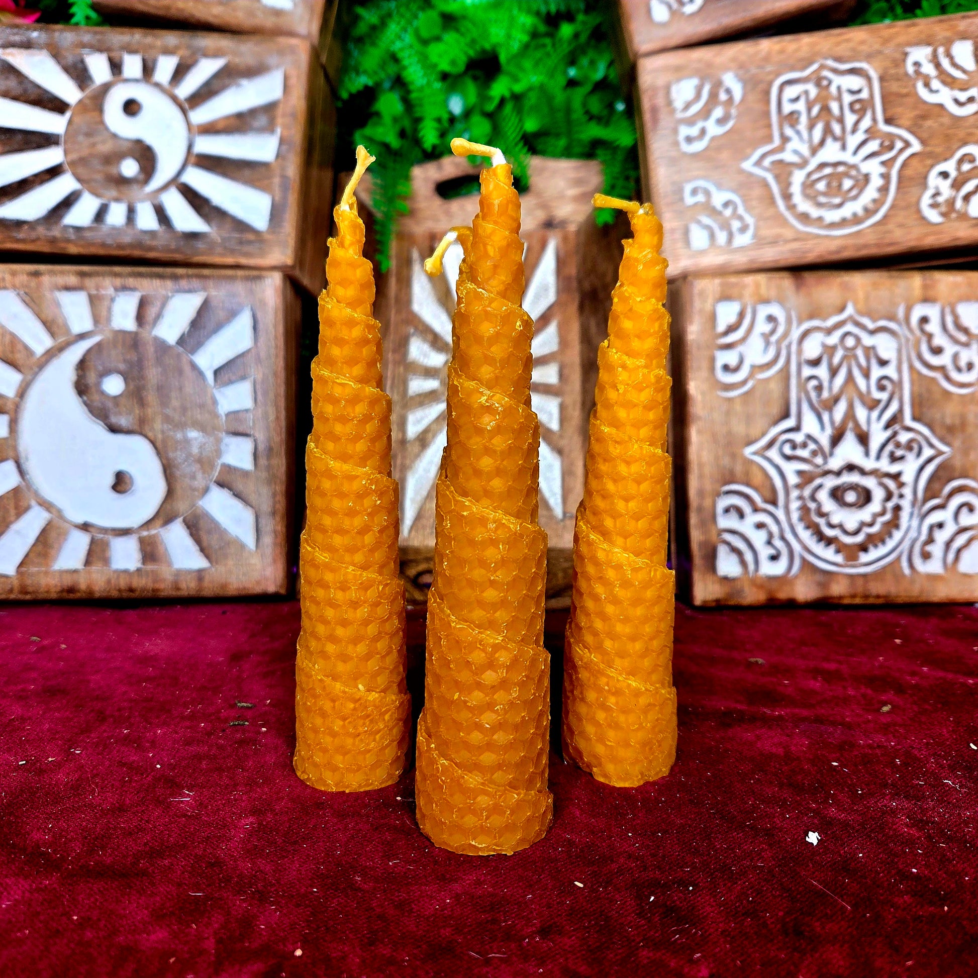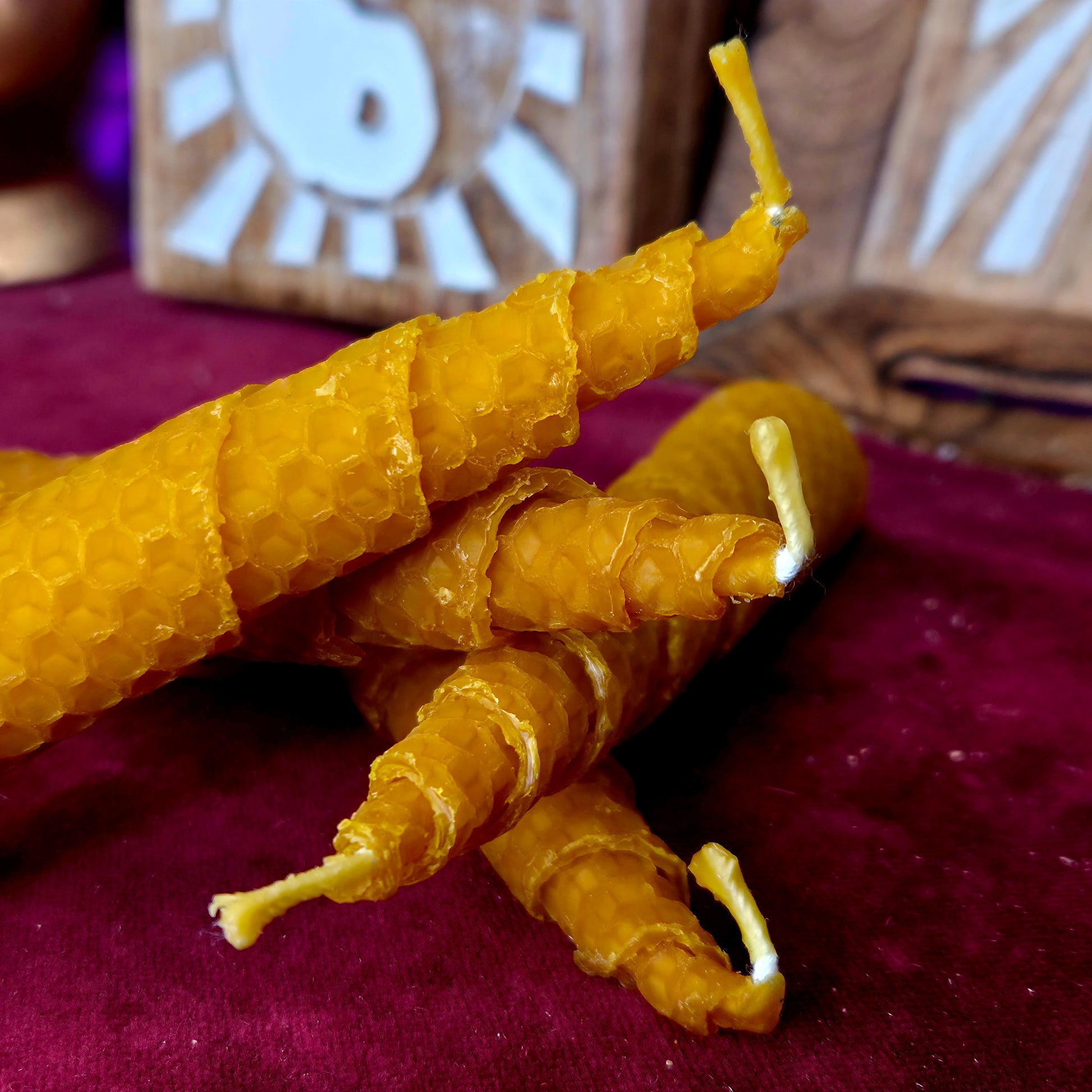 Cada vela está hecha a mano con cera de abeja pura y miel natural, lo que le da un aroma dulce y reconfortante. La combinación de la cera de abeja y la miel crea una vibración energética que atrae la abundancia y la prosperidad a tu vida.